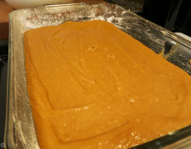 En un plato seguro del horno del 9 "x 13", agregue la mantequilla para cubrir cada lado y abajo. Espolvoree harina sobre la mantequilla y sacuda el exceso. Esto ayudará a la torta de calabaza separada de la bandeja fácilmente después de la cocción.
