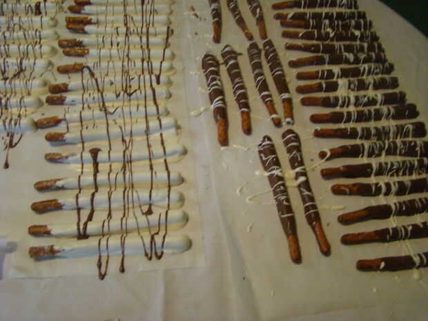Ahora estas se establecerá antes de toda la izquierda sobre el chocolate en los tazones de fuente se establece totalmente. Si necesita demasiado, derretirse el chocolate, 30 segundos en un momento en el microondas. Usando la cuchara, rocía el chocolate blanco sobre las barras de chocolate con leche cubierto y luego rociar el chocolate con leche sobre las varillas cubiertas de chocolate blanco. Esto es lo que voy a para la decoración de las varillas. Usted puede hacer lo que quieras, espolvoree decoraciones sobre el chocolate antes de que series, o aspersión de menta triturada sobre el chocolate antes, etc.. Son sus cañas, hacer lo que quiera con ellos. En cuanto a mí, que estoy hecho.