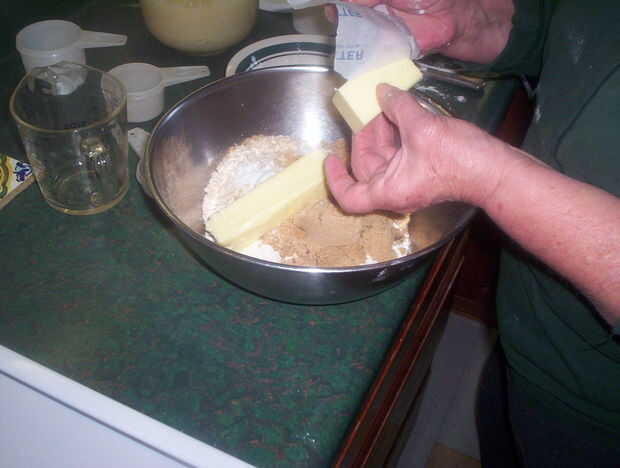 Combine todos los ingredientes de la corteza en un recipiente grande.  Bata a velocidad baja hasta que la mezcla es grumosa. (He sido conocido para mezclar con las manos)