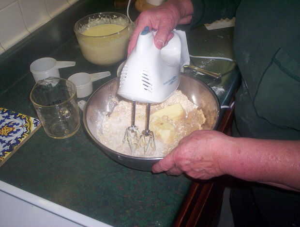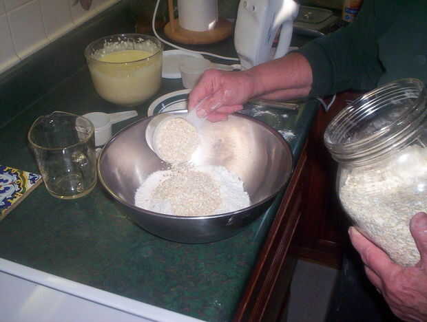 Rociar la sartén con aerosol o grasa de cocción y el fondo del recipiente de la harina.