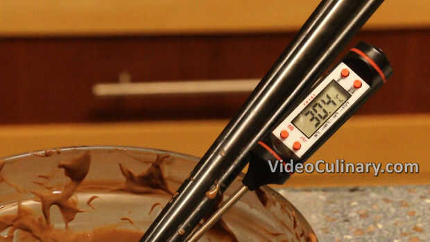 Coloque el recipiente sobre fuego lento el agua y calentar el chocolate hasta 29-31° C, revolviendo constantemente. ¡Ten cuidado! Si la temperatura sube por encima de 31° C, deberás empezar templando todo otra vez.