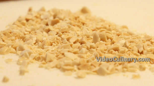 Hacer el turrón: picar los restantes 100 gramos (3 oz) de los cacahuetes asados y pelados. Picar los cacahuetes más pequeño que lo hizo para el caramelo de relleno. Colocar en un bol.