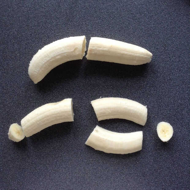 Banano demasiado maduro es los mejor, como son el más dulce y dará la base cremosa (y te dan una excusa para hacer Snickers!). Pelar los plátanos, cortarlos por la mitad y corte los extremos (sólo por estética – omitir si usted no se preocupa). A continuación, dividir los trozos de plátano por la mitad, coloque el corte hacia abajo en un plato y ponerlos en el congelador para un par de horas y o durante la noche. Congelar los extremos para un batido o simplemente les engullir!