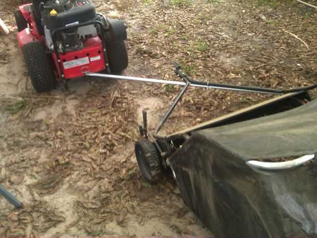 Mi es 42" de ancho, y mi cortacésped corta una franja de 30". Yo quería el centro de a la hilera siguiente. En la primera foto, alineados basados en neumático del cortacéspedes. Sin embargo, es mejor alinear la barredora al centro de la fila de descarga recortes! Lo siento, no tengo ninguna guía de cómo ajusté, pero mediante el uso de abrazaderas, se puede modificar esa posición final.