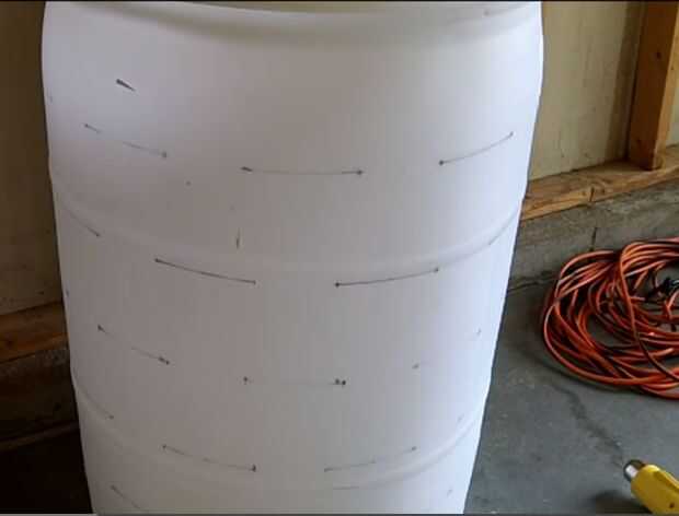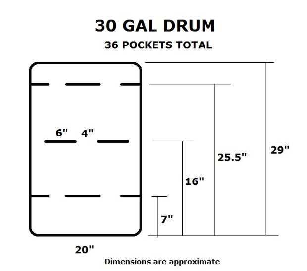 Han proporcionado las dimensiones utilizadas en mi tambor de 30 galones, pero no tenga miedo de hacer algunas mediciones y haciendo un poco de matemáticas de su propio. Usted no puede ir mal si haces todas tus marcas con un rotulador antes de cortar cualquier cosa. Recuerde escalonar los bolsillos con todos los niveles. Si se va a hacer un tambor de 50 galones, probablemente iría con 4 niveles de bolsillos.