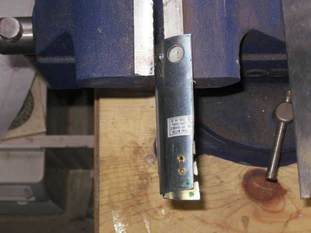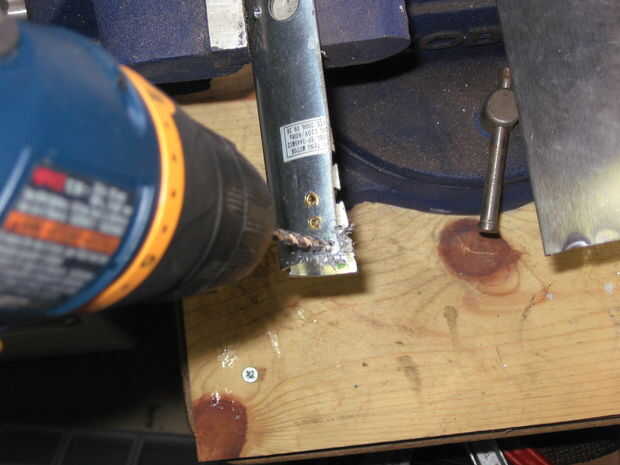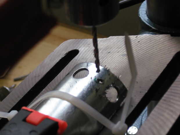 Utilice al calibrador de tornillo y averiguar el diámetro de los tornillos y remaches. Una vez que tienes esta información palmada la mitad de la carcasa del motor en el taladro. Asegúrese de que fijar firmemente la pieza. Improvisé con las abrazaderas de muelle y bridas. Le animo a encontrar un método más seguro. Ahora perfore los agujeros de tamaño adecuados para los remaches en la parte superior.