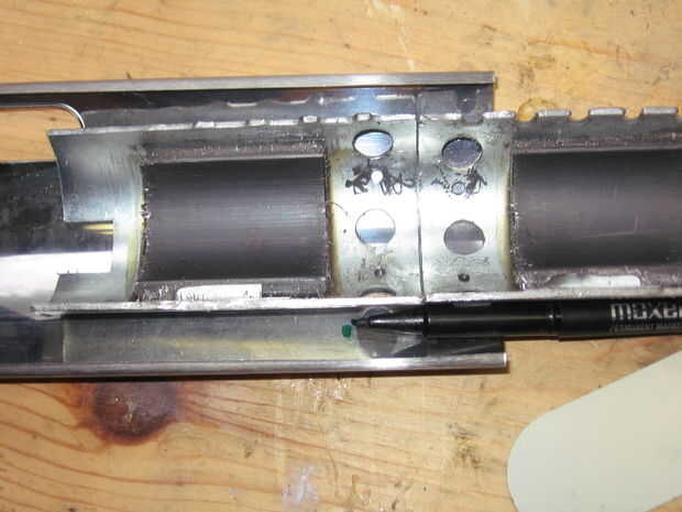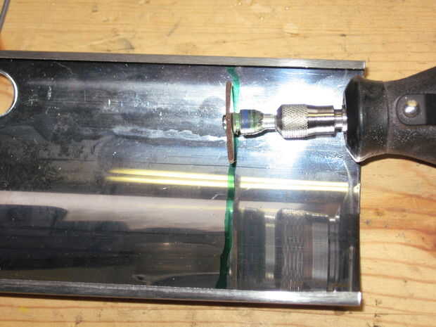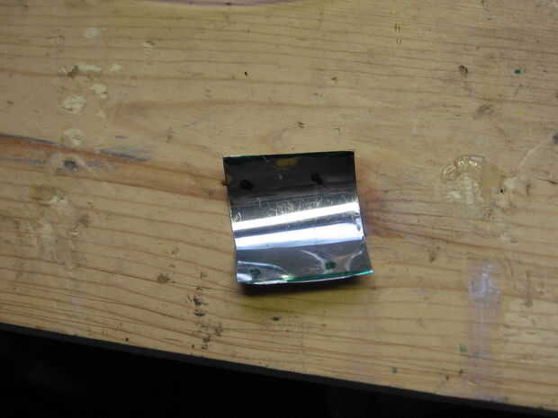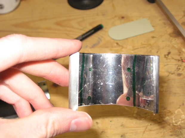 a continuación vamos a hacer la pieza de metal que se realmente se unen las mitades de la barredora. Averiguar cómo una amplia pieza de metal que necesita. Lo hice colocando las mitades de la barredora en un pedazo de chatarra. Marqué el metal más allá de los agujeros perforado y marcado la posición de los agujeros. Luego cortar el exceso del metal de la pieza que quería. Una vez que fue cortado a la medida había Mellado las posiciones de los agujeros con mi metal hammer punch y ballpeen. Luego perforé los agujeros con el taladro en la posición marcada con la misma broca de tamaño que usé para los agujeros de remache en la carcasa del motor.