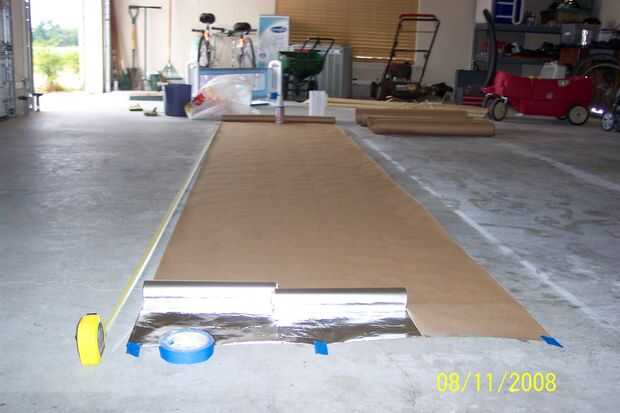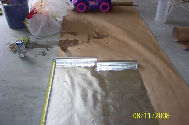 This is easy. Estirar el papel en longitudes predeterminadas. Usé 12 pies porque eso es lo que necesita mi ático. Cinta de la extremidad de partida abajo con cinta adhesiva si quieres. Spray adhesivo para papel de enmascarar en un patrón amplio de 2 pies. Luego rodar el papel de aluminio a partir con el rollo de la izquierda y vuelta 1/16" con el segundo rollo. Al llegar a la longitud deseada, corte la barrera radiante ahora terminada, deje el exceso 1 ft hasta la instalación. Luego usé una escoba para limpiar y presionar el papel para el papel.