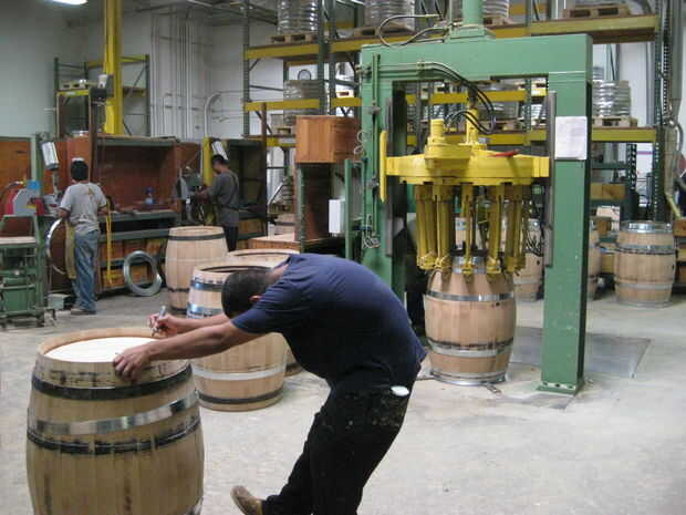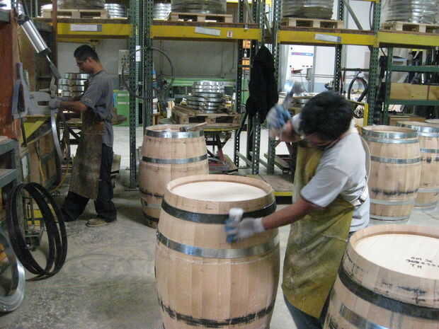 Complació mi interés por barril haciendo visitando uno de los pocos de Enlibrados en país del vino - Demptos en Napa. Tonelería es una reliquia de la tecnología de hace miles de años que ha sobrevivido de alguna manera. La fábrica está muy mecanizada, pero la física de la construcción de un barril siguen siendo la misma - uso de calor, presión y vapor para doblar la madera, tostar los interiores para caramelizar los azúcares de la madera y atar todo con aros de metal. Todavía me sorprende que no escape sin ninguÌ n pegamento. Y son sorprendentemente fáciles de moverse a mano, a pesar de su peso. Es una auténtica maravilla de la carpintería y la geometría. La partida para una nueva cuesta alrededor $500-$600.