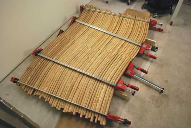 Pegue las piezas restantes hasta que esté listo. Compruebe para asegurarse de que todo es plana todo el camino alrededor. Si una sección está tirando al revés, cambiar la orientación de la abrazadera. No fije más de dos piezas en un momento ya que será muy difícil mantener todo plano. El pegamento se endurece rápidamente y estará listo para trabajar en 2 horas.