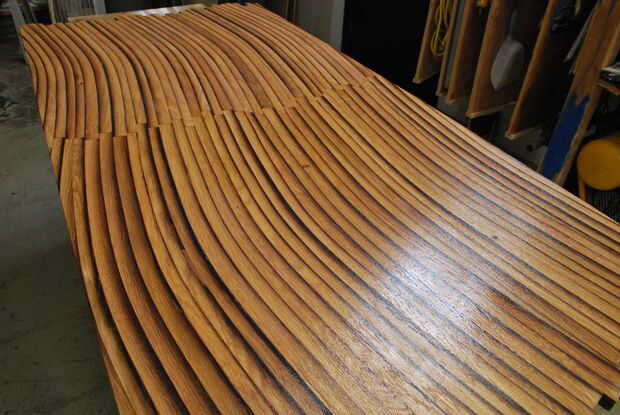 En la tabla original (esta fue la segunda hicieron), tuviera un finisher local poner el barniz de la conversión, que es un producto de dos partes que se asemeja a una carcasa de plástico. Se utiliza en restaurantes de mucho y es muy durable, pero tiene un poco de acumulación de que algunas personas piensan que hace madera parezca artificial.