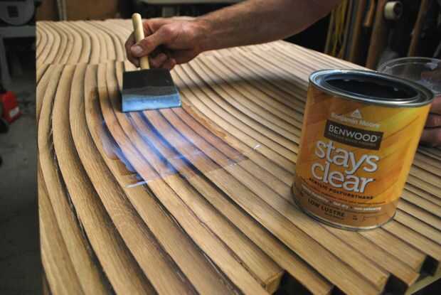 Apliqué dos capas de un barniz de uretano satinado con un grano de luz 220 lijado entre capas. Utilicé un pincel de espuma en la foto, pero creo que un cepillo de cerdas habría sido una mejor opción, ya que fue difícil difundir el barniz uniformemente.