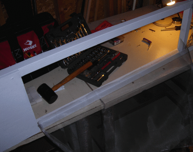 Pantalla de la ventana entonces fue cortado para que coincida con la zona donde se instalarían los estantes de alambre. La pantalla fue con grapas hacia abajo.