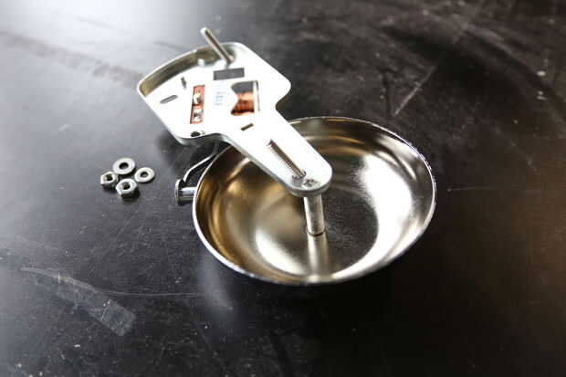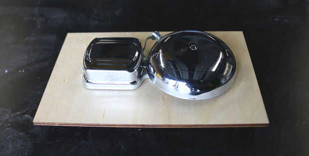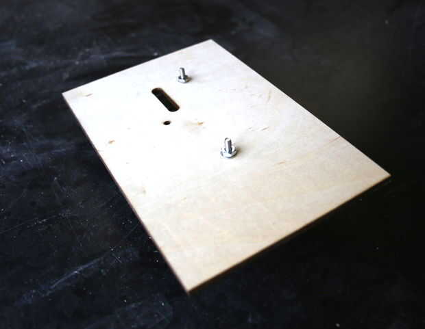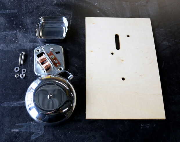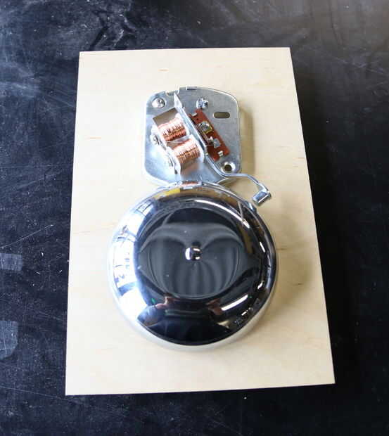 La cara frontal de la caja está diseñada como un montaje de la campana. El timbre eléctrico viene con tres agujeros en la placa trasera para este propósito. Retire la placa frontal sobre Electroimán de la campana a orificio de montaje superior. Enrosque los tornillos en los orificios superior e inferior, como se muestra en la imagen. Sólo terminó con dos de los tres orificios que cortar en el tablero. La ranura grande en la Junta desliza sobre dos pedazos de metal de la campana que va conectada a la Junta. Es importante que usted aún puede acceder a estas protuberancias la campana montada. Utilice un par de arandelas y tuercas para la campana a la Junta. Dependiendo del tipo de campana que se comprar, el espaciamiento del agujero puede ser diferente, así que use un par de pinzas o una regla para tomar medidas. La campana se debe montar ahora firmemente en el tablero. Reemplace la carcasa metálica de la campana para proteger el electroimán.