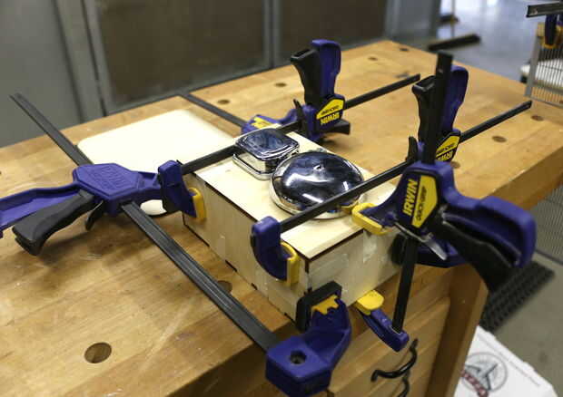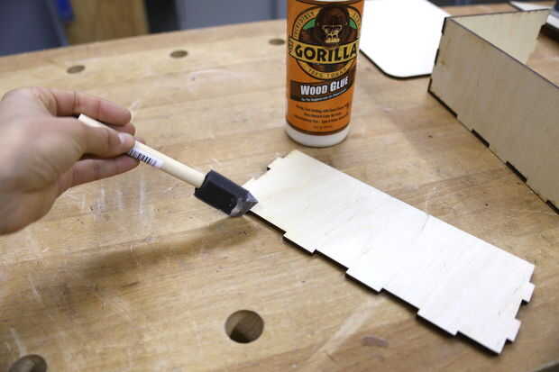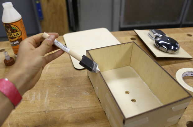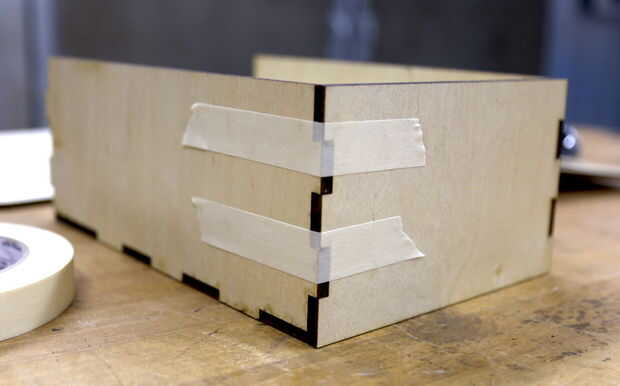 Pintar la caja dientes interiores y los bordes con pegamento para madera y aplique cinta de enmascarar a los bordes adyacentes para mantenerlos en su lugar mientras se seca. Para estar seguro, sujeta también paredes opuestas juntos. Espere un mínimo de 30 minutos para el cuadro se seque.