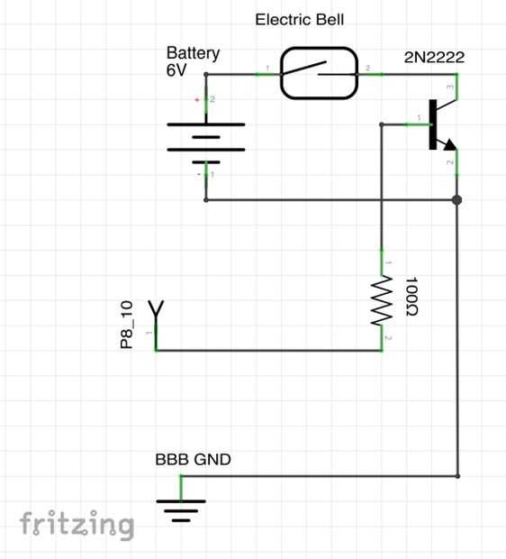 • El segundo cable de la campana eléctrica se conecta al colector de un transistor de npn 2N222. Este transistor actúa como un relé, que controla el flujo de la corriente de colector a emisor el pin 'P8_10' en el BBB.