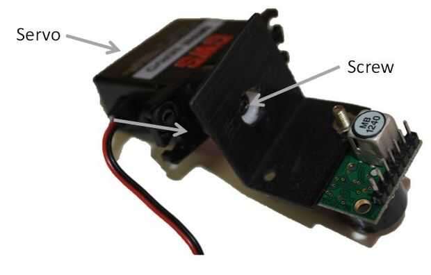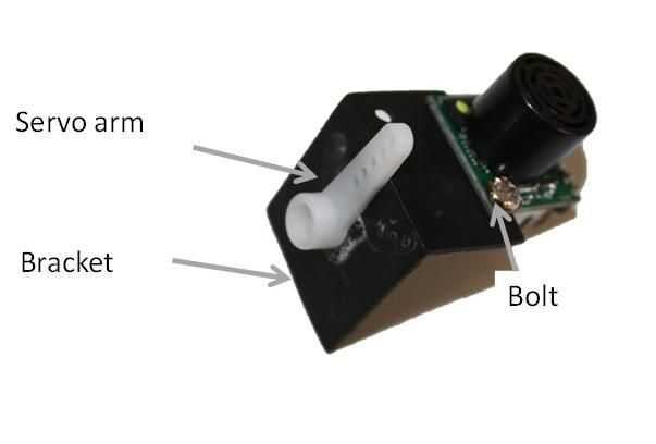 2. Conecte el telémetro ultrasónico a un brazo de servo usando una abrazadera de ángulo recto. Esto puede ser modelado de plástico chatarra - o utilizar una gota decente de Blutak.