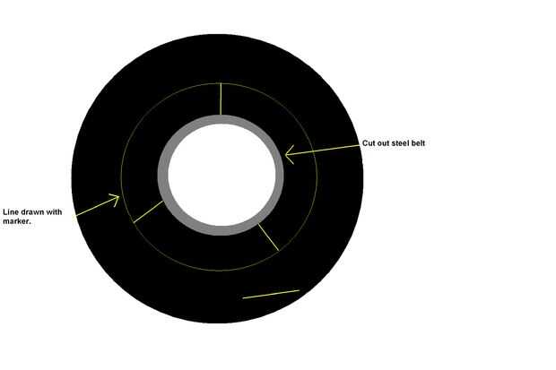 No tomar fotos de cada paso porque construí esto aproximadamente una hora. Espero que mi dibujo tiene sentido. Básicamente usted solo Coloque el neumático en el suelo, centro del cañón en la parte superior del neumático y dibujar alrededor de él con un marcador. Usted entonces sacar el cañón. No trate de cortar a través de los cinturones de acero en el interior de la llanta. Un par de agujeros en el neumático del taladro en su lugar, montar una sierra a través de los agujeros y corte del acero de la correa alrededor de todo el camino hasta su salida. No trate de cortar el círculo hacia fuera que usted señala con el marcador. Corte cerca de la correa de acero y corte 3 ranuras desde el centro de la llanta a la línea que trazaste. Esto le dará una especie de picadura de fricción en el barril cuando se inserta en el neumático.