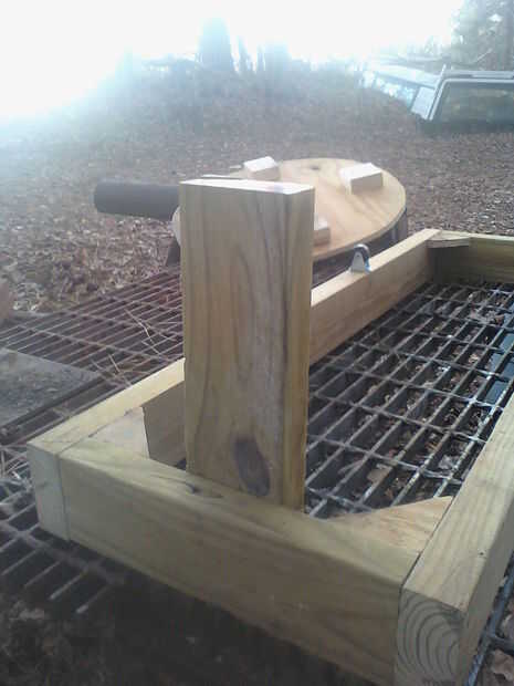 En segundo lugar, puesto que el marco era más de lo que esperaba, he añadido el 2 x 4 corto al final como un 'stop' para el cañón. Esto es para prevenir el barril Deslice el extremo como él está siendo girado.