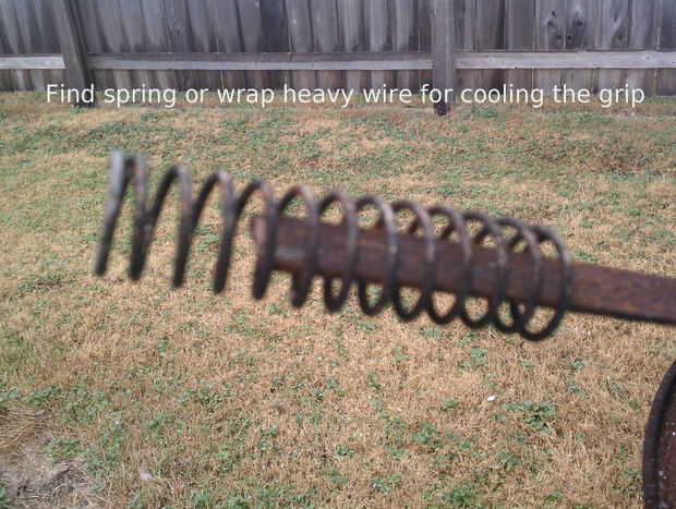 Solía ser a partir de tornillos de cuerpo de auto fije la empuñadura, rosca para arriba - la cabeza en el barril. Al parecer evitar moho y burnout mejor esa manera. El mango es solo 1" plano. Me ha pasado tener un resorte para hacer un agarre, pero envuelve más pesado del alambre hace lo mismo - disipar el calor y llegar a donde usted puede agarrar la manija con un guante y no quemarse. (Puede utilizar el mango en su barril siguiente cuando éste finalmente se quema)