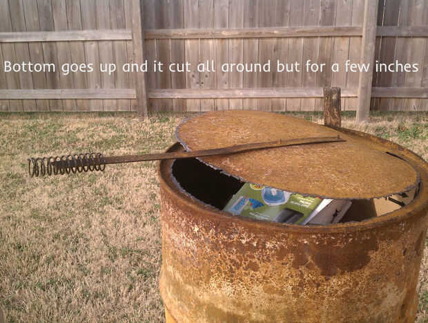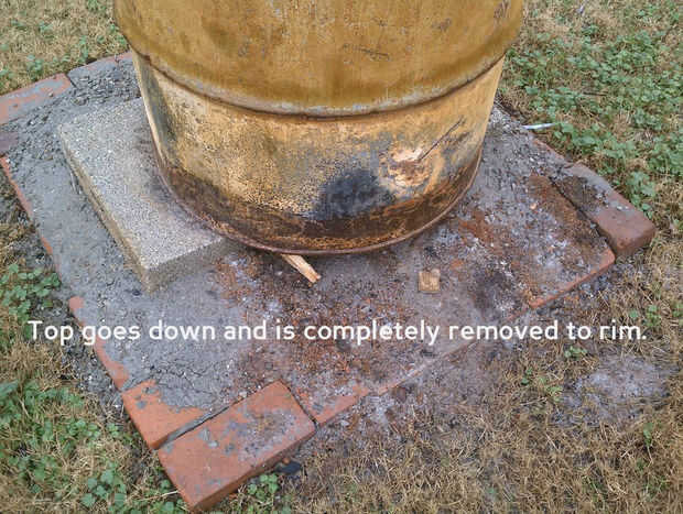 Corte la parte superior y el lugar que terminan hacia abajo. Corté a la llanta quede sin labio para agua y moho. Corte la parte inferior claro alrededor excepto por unas pocas pulgadas para la bisagra - poner ese final. He encontrado el calor impide que agrietarse de tensión, pero si rompe, solo puse la parte superior entreabierta un poco al control de la tarifa de quemadura. Si lo estoy quemando papel colocar una pieza de rejilla de metal estirada como un amortiguador de chispas - sin necesidad de madera.