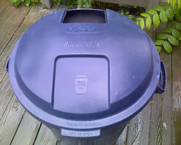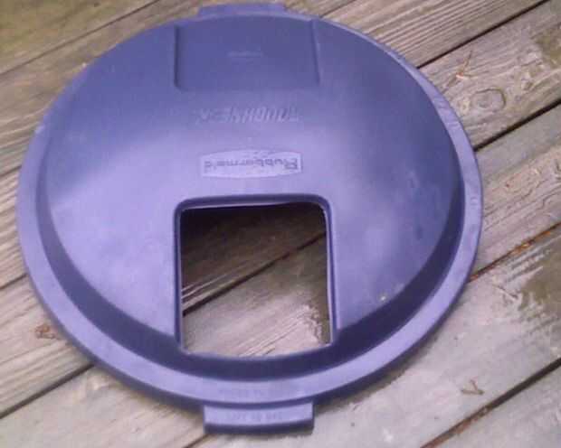 supongo que no sea estrictamente necesaria, una tapa, pero creo hace que se vea un poco mejor, y evitará residuos acumulando encima de su barril de lluvia. Con la navaja corte una abertura en la tapa de la papelera. Se trata de la entrada de la bajada de agua de sus canales. Ponga la tapa en encima de la pantalla y su barril de lluvia es completo.