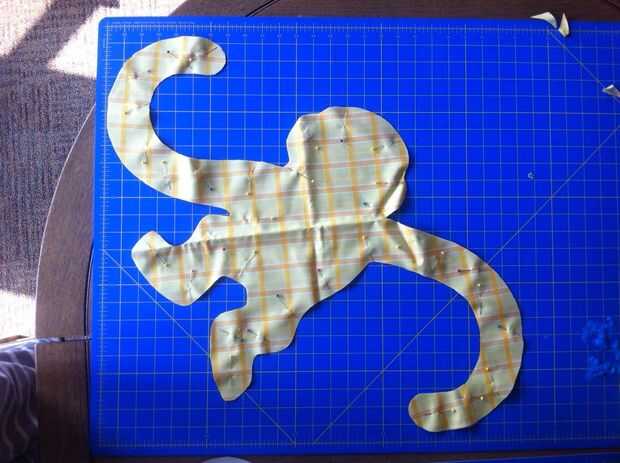 Coloqué el patrón encima de dos capas de la tela derecho con derecho juntos. Me cubrió el patrón y luego con cuidado cortar la tela. Una vez que se cubrió las dos capas (con derecho), los cosen con 1/4 costura asegurándose de dejar un par de pulgadas a ser capaz de dar vuelta adentro hacia fuera.