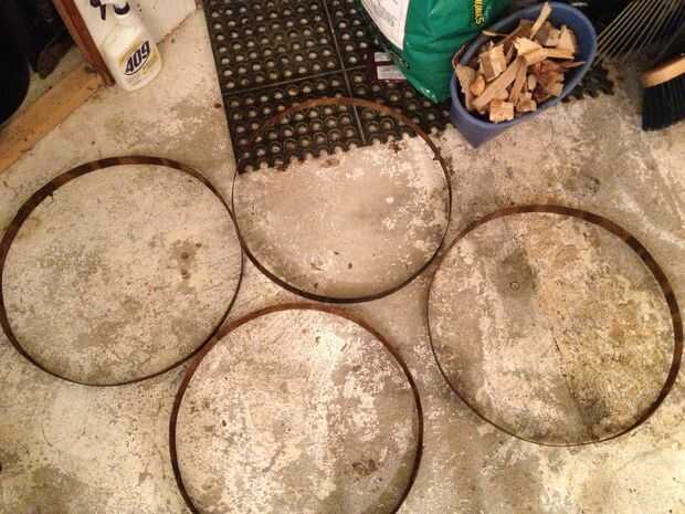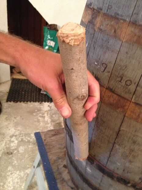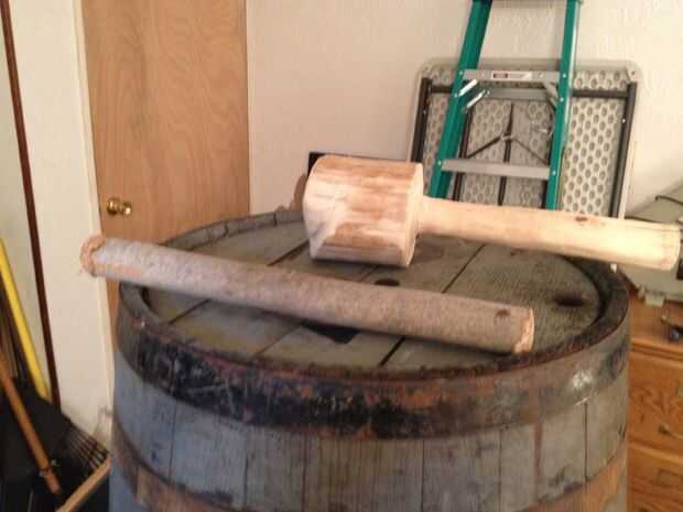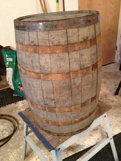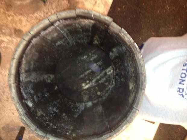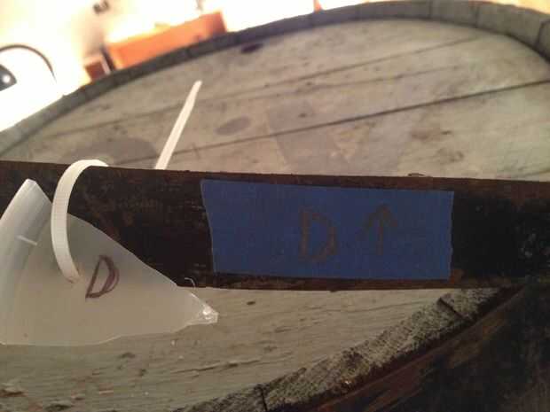 Luego me saqué los aros tocándolos apagado.  Primero usé un mazo y un pedazo de madera que se muestra en la imagen.  Funcionaba bien hasta que la pieza de madera comenzó a romper.  Finalmente me cambié al mazo y un cincel de mampostería utilizada para marcar y cortar ladrillos.  Trabajó mucho mejor.  Los aros son compresión fit por lo que era relativamente fácil de eliminar.  Luego quité la parte superior para encontrar estaba correcto en la asunción había algunos de la descomposición interior.  He dejado 2 aros en durante este proceso así que pude mantener todo en su lugar.  Yo también numerados todos los pentagramas a cuando volverla todos juntos. Solía ataduras de cremallera y plástico los aros para mover las etiquetas de limpieza después de la etiqueta.