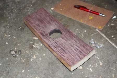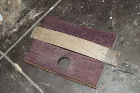 Empecé con la tabla que tiene el agujero. No tengo un tamaño exacto en mente, por lo que sólo alineó el pedazo de madera prensada ve en la segunda foto con los lados del agujero dibujó una línea en el lado opuesto de la tabla. Esto me ayudó a poner el agujero en el centro de la tabla y también aseguró que el tablón es uniformemente curvado al centro (desde un barril no es uniformemente curvado, pero simétricamente se curva). Usé una sierra para cortar la madera, pero cualquier mano vio o jigsaw hará el trabajo.