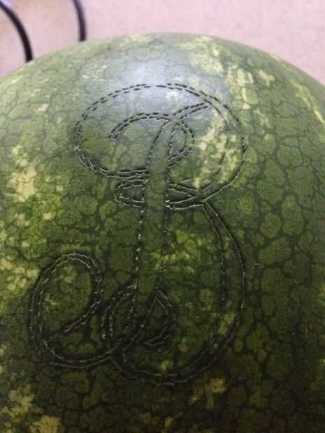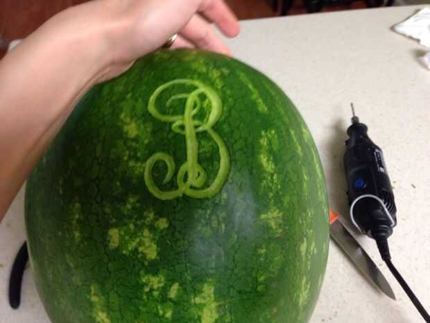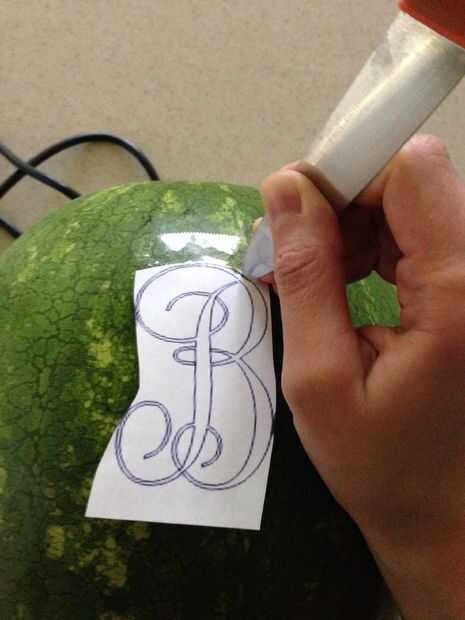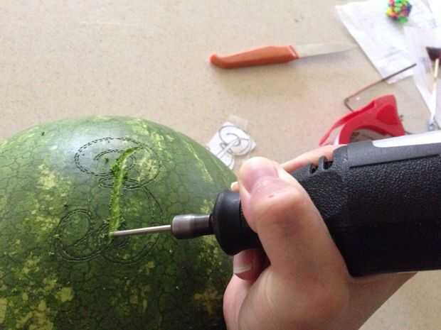 Centro de su plantilla y cinta adhesiva en su lugar. Coger un cuchillo y empezar a hacer pequeños pinchazos por el diseño para transferir al melón. Una vez efectuada su transferencia, utilizar la Dremel para tallar el patrón. Es más fácil si usted elige un lado de la línea y el palillo a él hasta el final de esa línea. Volver a pista y sacar las partes más grandes de las líneas.