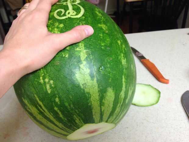 Coloque el melón de lado y cortar cuidadosamente la parte inferior hasta que se una superficie lisa y plana que puede sentarse a nivel de un contador. Tenga cuidado de no para despegar mucho que ves color de rosa (como hice yo :() usted sólo debe ser corte corteza de lo contrario corre el riesgo de fuga desde la parte inferior.