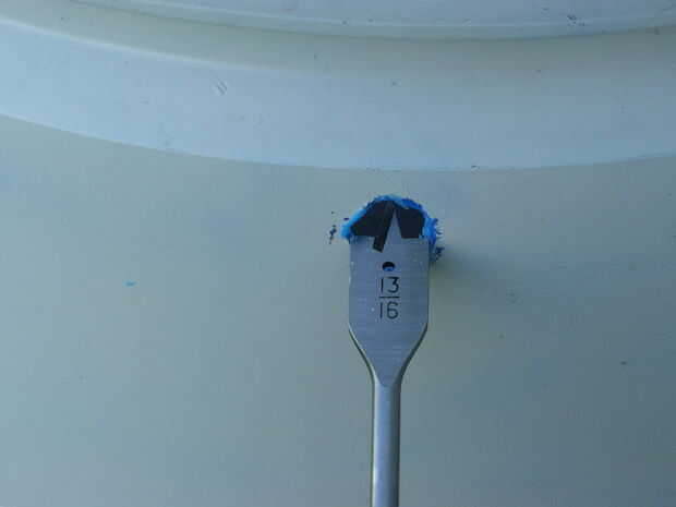 El interior diámetro del PVC será 1/2 pulgada pero el diámetro exterior es grande, por supuesto. Adiviné que el tamaño del agujero que sería de taladro fue 13/16 de pulgada. Esto resultó para ser perfecto. Está abierto sólo para la conexión con extremo roscado macho para agarrar dentro del agujero. Si usted hace todo más grande, se tambalea alrededor.