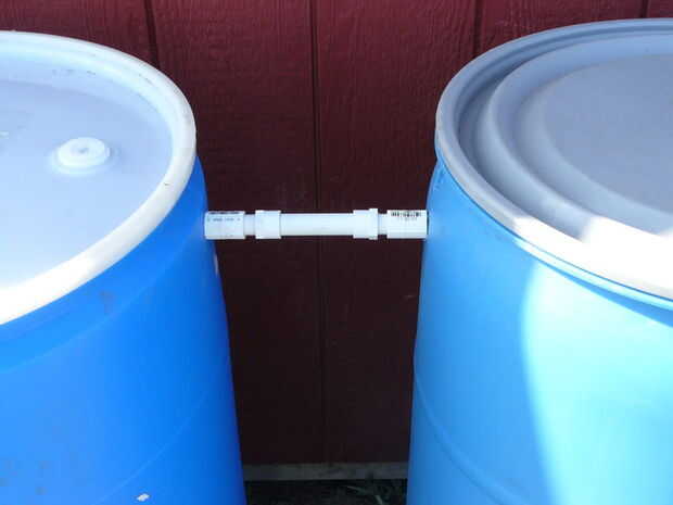 Decidí que, en lugar de tener el primer barril de goteo en la segunda, tendría cada flujo de barril directamente en el lado del otro. Los conectores son los mismos que antes. Simplemente corte una sección de 4" PVC de tubería y cayó en los dos receptores lisos hembra en cada barril. Si quiero desconectar, simplemente saco un cañón externo de otro y salga bien. No hay necesidad para el tubo de cemento. Puede ver los resultados en las dos fotos.