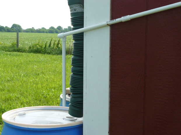 Esto demuestra cómo dirigí el agua de la cuneta frente a los barriles en la parte posterior utilizando tubería de PVC.