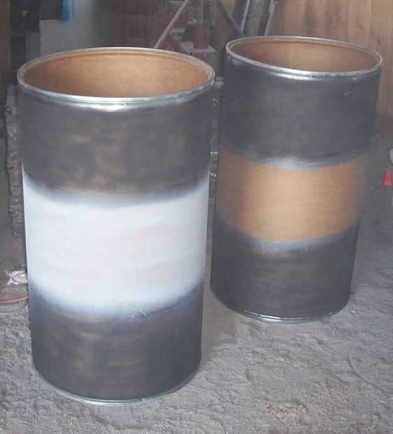 tengo algunos tambores de cartón vacías de 55 galones. Quería que se vean como los tambores de acero blanco y negro, por lo que hemos pintado. Nos aerosol pintado con imprimación y negro gris, y utilizamos cinta adhesiva a la sección de donde queríamos diferentes colores.