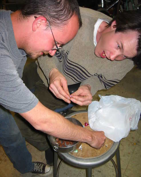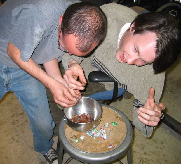 Aquí Peter Luka y Bayard Wenzel compiten para desenvolver besos de chocolate durante el primer intento de crear una barra de encogimientos de Ramen. Hemos aprendido mucho y el producto fueron bastante prometedoras para otro intento. Pasaron unos pocos días.