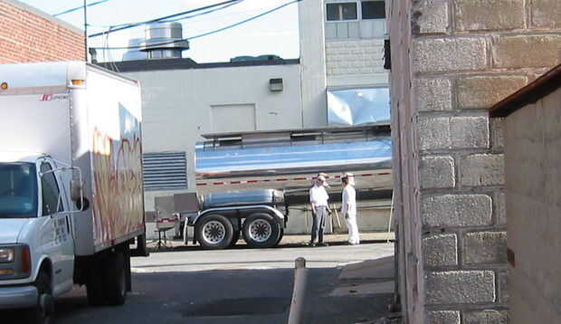 Cuando salí el conductor subió encima del tanque alcanzando en un ojo de buey con una escobilla de mango largo. Él estaba empujando el chocolate derretido hacia la manguera de la parte posterior del tanque. Le pregunté si podía obtener una imagen de él hasta en el carro. Dijo que "realmente no estoy cómodo con eso.