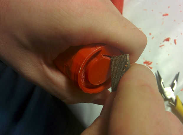 Con la punta cuadrada del archivo, hacer un pequeño bisel. Utilizar las fotos y el video como referencia. El bisel debe ser alrededor de 0.5 a 1mm de profundidad. Hacer pruebas de sonido periódicamente hasta que no oiga gorgeo más (al igual que en el último video).