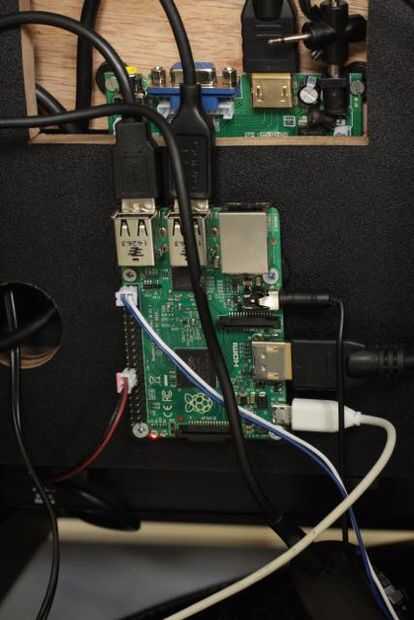 (Eventualmente) montara el Pi en el interior, conectado el joystick USB, altavoz USB, cable HDMI a la pantalla, frente LED y añade un botón de "salida" lateral adicional.