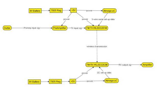 Hay un flujo de trabajo primordial de este pequeño proyecto. Utilizamos un suministros de 5V regulada, de pilas de 9V, para alimentar nuestros microcontroladores, preamplificador y transmisor/receptor. Los microcontroladores envían un flujo inicial de datos para configurar el transmisor/receptor para sus roles individuales. Utilizaremos la 104,5 MHz, aunque se puede ajustar fácilmente esto en el código dado.