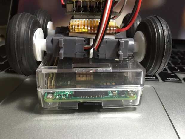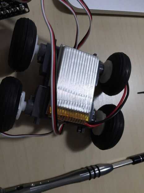 Utilice la cinta de espuma de doble cara de 3 M para pegarse 4 servos y la batería. Un cuadro pequeño le ayudará a alinear los servos. (En mi caso un caso frambuesa Pi)