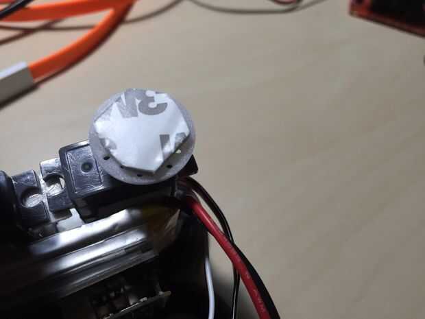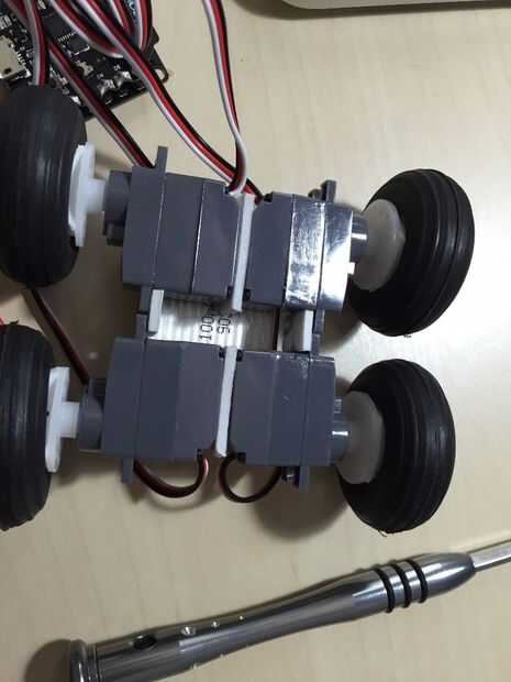 Pegar las ruedas a los servos. Dependiendo de su tamaño de forma de rueda, puede que necesite cortar la cinta en forma adecuada.
