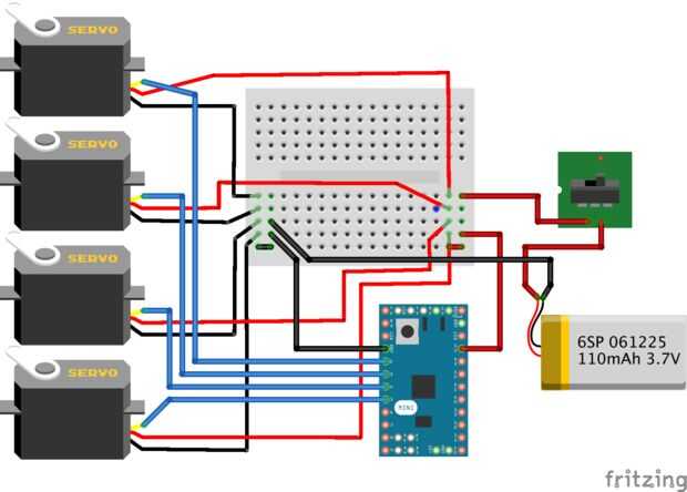Conecte la alimentación y la tierra de los servos y el micro controlador a la batería. Un conector JST es útil si necesita cargar la batería.