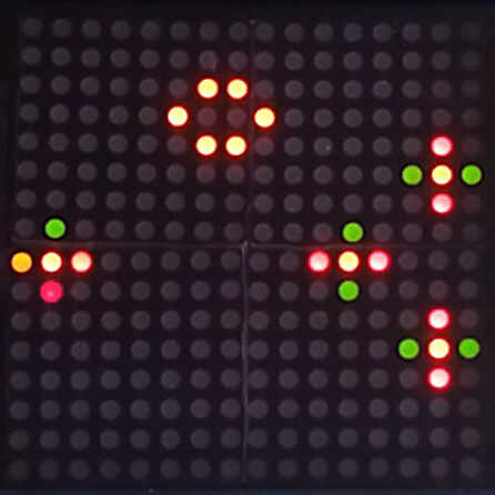 Energía y ser hipnotizado por los patrones cambiantes en la pantalla. Las células de color verdes son las células recién pobladas que dará vuelta a rojo si se las arreglaron para sobrevivir de una generación y luego a ORANGE si conseguían sobrevivir más.