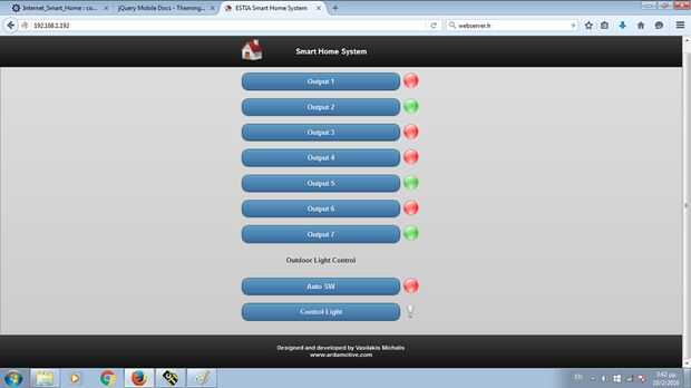 Oprima el botón para "encender" una salida. Usted verá que el círculo rojo se convierte en verde. Eso significa que su salida está programada a alta (se puede ver además de la salida del indicador led). Púlselo otra vez para apagué. No es sólo una imagen cambiante de la página html, sino una respuesta de tu Arduino! Si una salida no se dio una vuelta, el indicador de estado de salida seguirá siendo rojo!