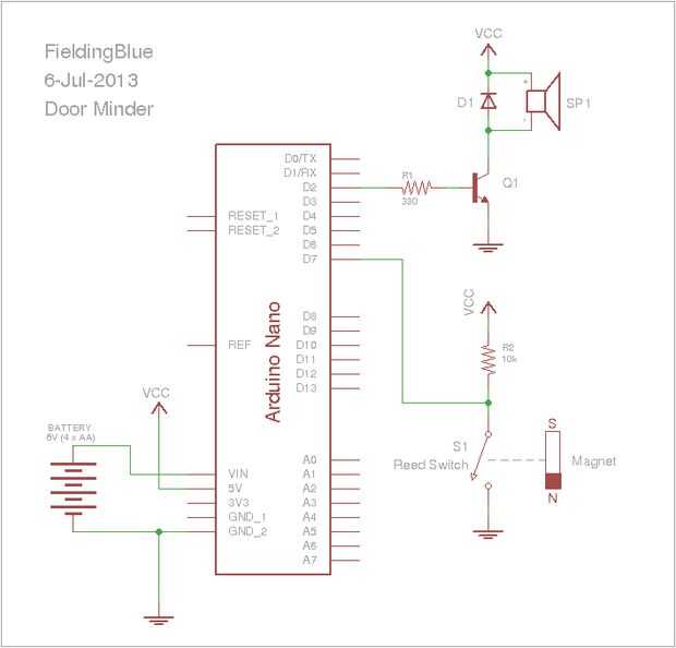 Para el circuito de sentido que he utilizado un interruptor de láminas magnético normalmente abierto conectado a 0v y un 10 k Levante resistor conectado a Vcc. He probado una resistencia más grande al reducir la corriente de reposo, sin embargo la entrada digital del Arduino se convirtió un poco fiable. El interruptor reed está conectado al pin digital 7.