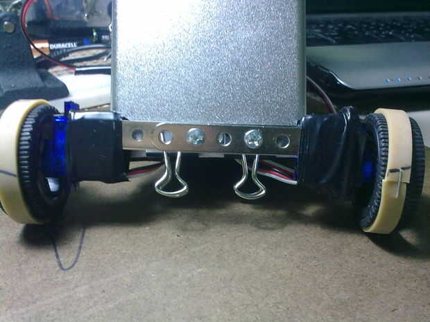 Para conectar los servos a la plataforma, utilicé piezas del sistema de construcción con la ayuda de la cinta eléctrica. No deseo hacer ningún accesorio permanente a esta plataforma aún. Así que la cinta hizo un buen trabajo de sujetar el eje a las ruedas. Y con la ayuda de dos carpeta de papel, os adjunto el eje a la caja USB.