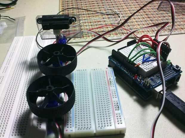 En este video, estoy probando el robot completamente montado en el laboratorio para asegurar que las ruedas están reaccionando correctamente a la información del radar IR. Por supuesto esto sólo prueba la exactitud de las indicaciones de giro de la rueda. Sin tracción de la rueda, no es posible saber cuánto tiempo las ruedas deben girar para hacer un buen giro. Estos datos se pueden medir sólo al probar el robot en la superficie del blanco. En mi caso, suelo de mármol.