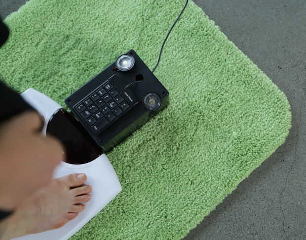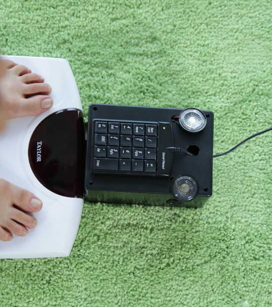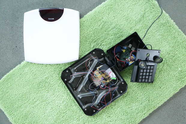 La escala motivacional de cuarto de baño se hace con una báscula de baño barato conectada a un amplificador y un Raspberry Pi. Un teclado numérico se conecta a puerto USB de la Pi. Comentarios Sassy son guardados en el Pi y jugados a través de altavoces de 8 ohmios conectados a un amplificador de audio.