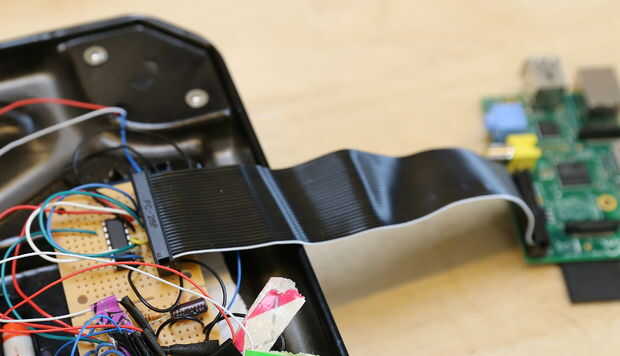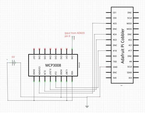 El Raspberry Pi solo no puede leer entradas analógicas como un Arduino u otros microcontroladores. Un convertidor de analógico a digital (ADC) es necesario para la Pi a leer la señal de salida del AD620. Un chip de MCP3008 ADC actúa como un puente entre la salida del amplificador analógico y la entrada digital de Pi. El MCP3008 está conectado a los pines de macho a macho encabezado dos 1 x 13 que se sueldan en la placa. Actúan como un improvisado Zapatero Pi de frambuesa. Las patillas de la cabecera están conectadas con un cable de cinta que el Raspberry Pi. Mire el diagrama del circuito incluido para cómo conectar el MCP3008 a la Pi.